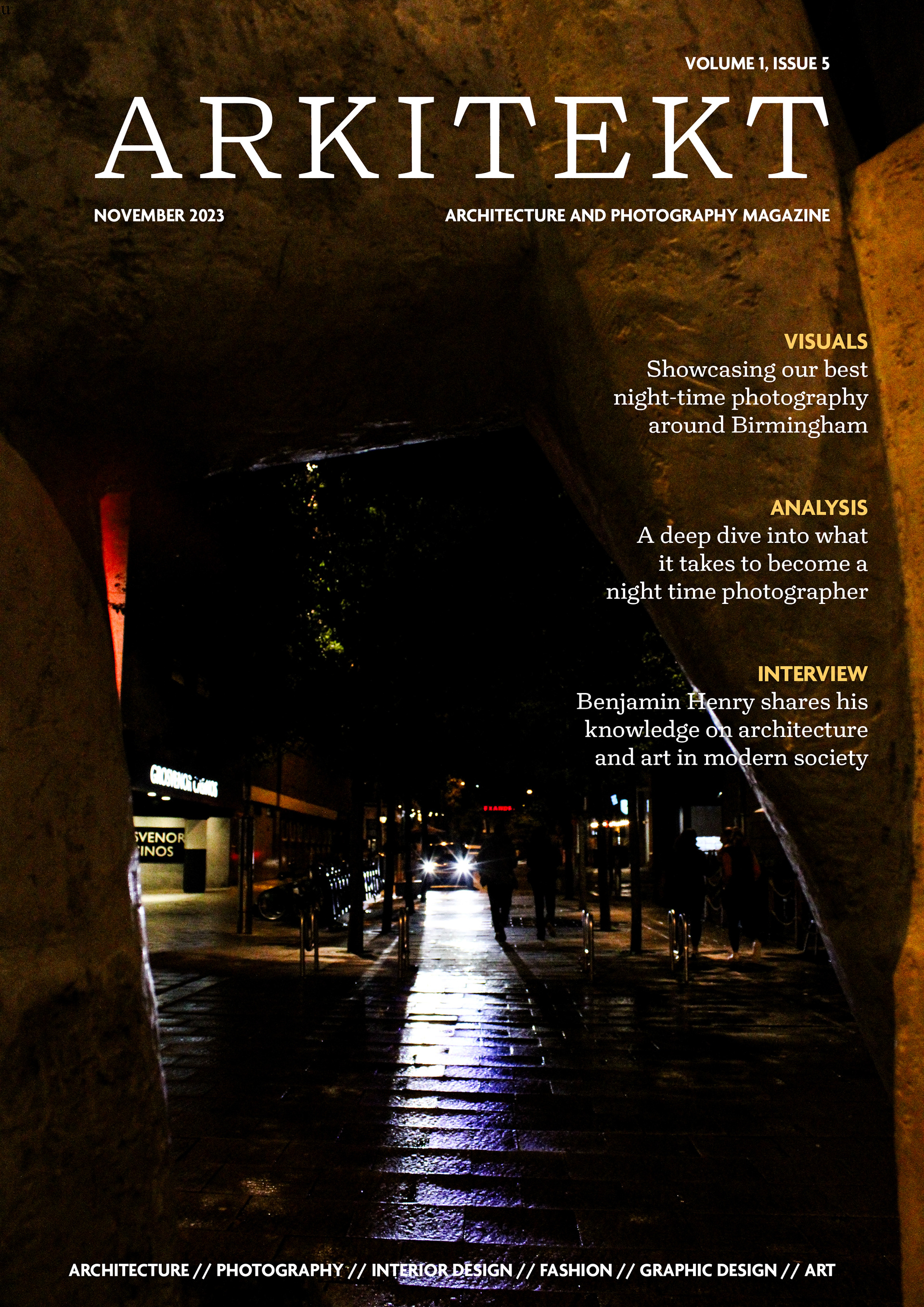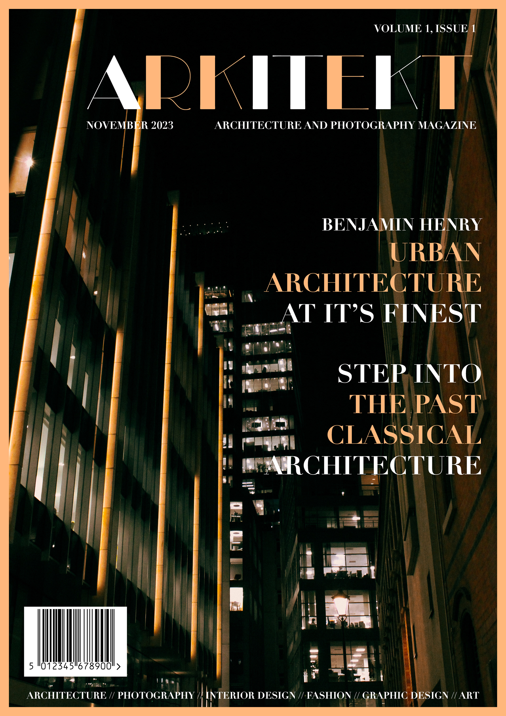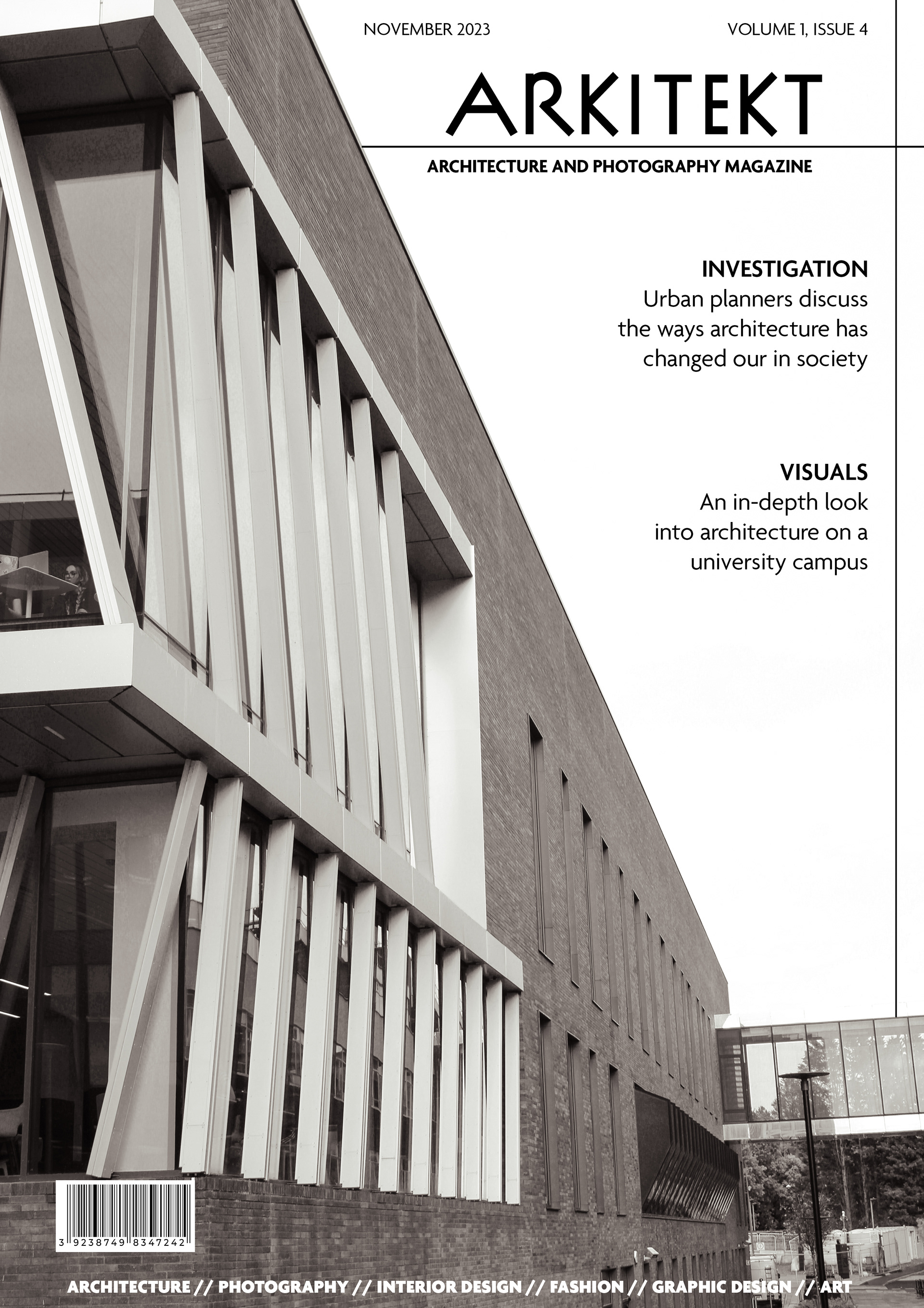 Arkitekt is an editorial design project exploring the relationship between architecture, form, and visual storytelling. I designed a series of magazine covers and feature spreads that combine modern typography, structured layouts, and minimalist composition. The project integrates my own architectural photography to create a cohesive visual identity that reflects the precision and creativity of contemporary design.